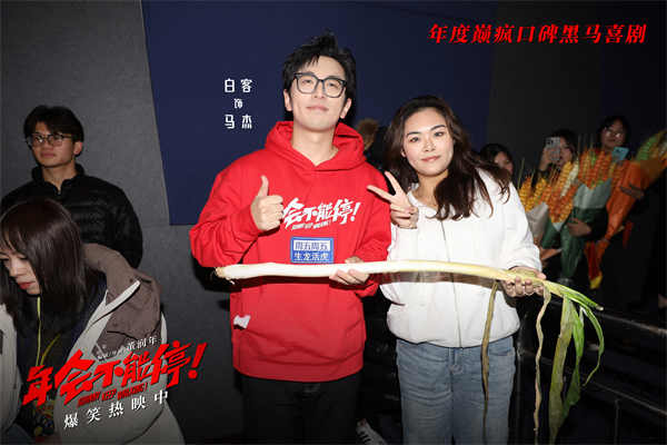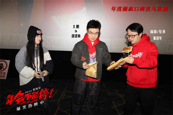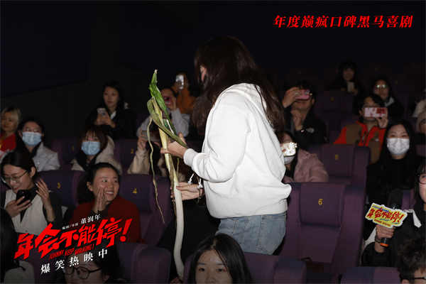 主创们在路演现场收到不少颇具当地特色的美食,包括观众特别提醒“要跟电影中的上班族一样得卷着吃”的山东卷饼,送给山东人白客的代表家乡味的大葱,还有观众给全体主创准备了济南特产绿豆糕,并表示其中暗含谐音梗,庄达菲机智解读“《年会不能停!》上座率都高(绿豆糕)”,美好寓意让主创颇为感动,也向观众送上“2024年背锅加班不能有,升职加薪不能停”的新年祝福。影片正在好评热映中,相信必定会让观众欢乐跨年笑到上头。