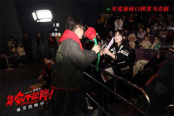 电影《年会不能停!》戏谑反讽现代职场怪象,密集的笑点和辛辣的抨击让观众深感欢乐与共情,编剧兼导演董润年、演员大鹏,白客、庄达菲在济南路演现场收获大量好评,“所有笑点都很真实”“轻松搞笑地表达出打工人的真实心声,让人在欢笑里有所感悟”。有职场新人产生强烈共鸣:“感觉白客老师和达菲姐姐就是在演我的精神状态,看的时候精神得到充分放松,这几天加班的疲惫都被纾解了,非常棒的一部电影”。还有观众幽默表示,大鹏和白客都是初代网络喜剧巨头,而喜剧巨头生活当中是不是真的“巨头”要用数据说话,所以带了尺子想量一下头围,台下观众也纷纷猜测起大鹏的头围,现场氛围颇为热烈。