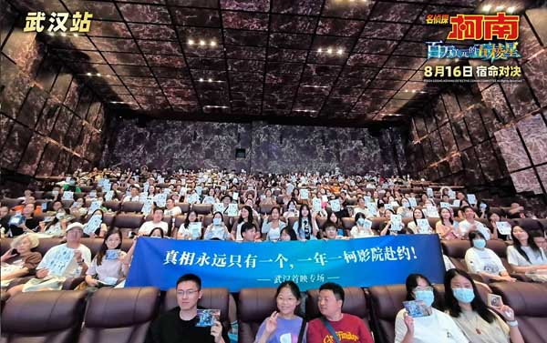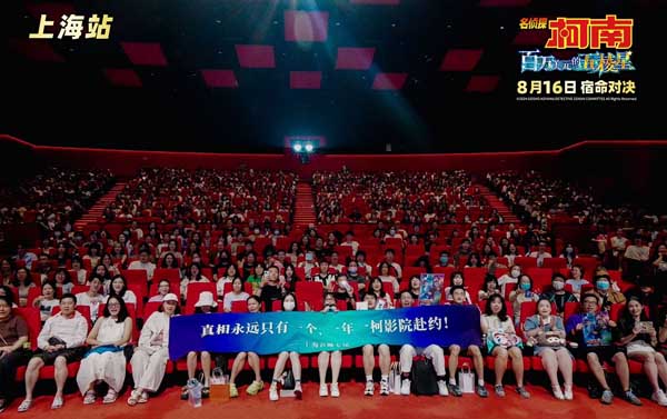 在8月10日举办的中国五城首映礼中,精彩内容更是数不胜数。在每座影院的厅外,都设置了精致还原的场景,有符合七夕节日浪漫氛围的平次和叶告白墙,有还原影片犯罪现场的置景,还有许多角色立牌错落排列,都吸引粉丝纷纷拿出手机拍照纪念。在上海影城内更是有超长天幕悬吊于顶上,观众抬头便能看到本部剧场版中的角色,从上至下都给足沉浸感和仪式感。